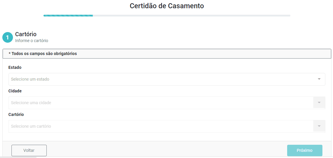 Passo dois: Depois de clicar sobre a opção “Casamento” você será redirecionado a uma janela onde deverá informar informações como: estado, cidade e o cartório onde a união foi oficializada.